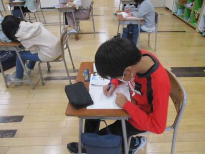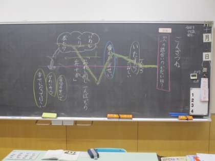 3時間目の4年生は国語の授業をしていました。今学習を進めているのは、ご存じの「ごんぎつね」です。この学習では、作品の理解を深めるため、気持ちを表したグラフを作っていました。