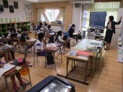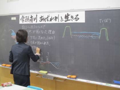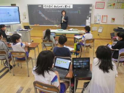 3時間目の4年生は社会科の授業でした。今日の学習では、子供たちにとって身近な常願寺川について、川底が低くなった理由などについて考えました。