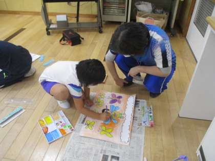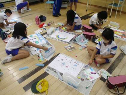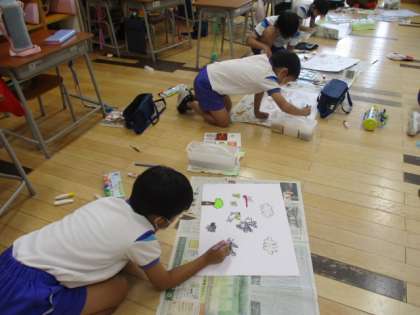 2年生は4時間目と5時間目の2時間を使って、図画工作科で絵を描きました。「○○となかよし」という題の絵を描きます。チョウやクワガタ、とんぼ等といっしょの絵を描いている児童がいました。