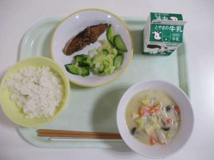 今日の給食献立は、ご飯、牛乳、フクラギのごまダレかけ、合わせ和え、五目みそ汁 でした。