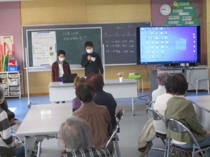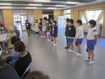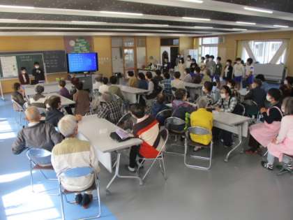 2時間目の6年生は、地域の方々との交流を深める「カフェ和いわい」に参加しました。このカフェの前半は、小学生とのふれあいのコーナーです。6年生が念入りに考えた企画で盛り上げます。では、司会・進行スタートです。