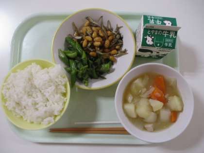 今日の給食献立は、ご飯、牛乳、小魚入りフライビーンズ、海藻サラダ、ポトフ でした。