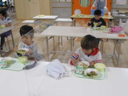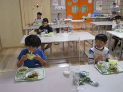 2枚の写真は、3年生の給食風景です。おいしそうに食べています。