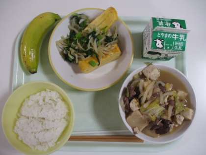 今日の給食献立は、ご飯、牛乳、厚焼き卵、モヤシのおひたし、すき焼き、バナナ でした。