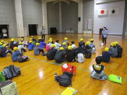 立少へ到着です。荷物を置いたら、プレイルーム(体育館)で集合、そして直ぐに来拝山登山の準備です。