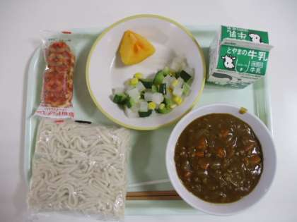 今日の給食献立は、ソフト麺のカレーソース、牛乳、チーズドック、大根サラダ、柿 でした。
