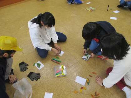宿泊学習最後の活動は、木の葉のしおりづくりです。事前に集めておいた木の葉を使って、きれいなしおりを作ります。しおりには文も書くことになっているので、みんな頭をひねっていました。