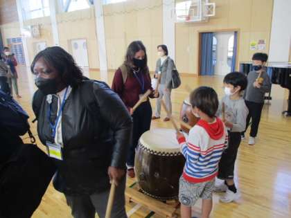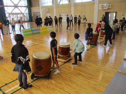 児童たちは最初、ぞろぞろと入ってくる見たこともない人たちに不安そうでしたが、演奏の後、大きな拍手をもらい1つの太鼓をいっしょに囲むことで、少しずつ打ち解けていきました。