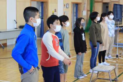 集会委員の進行で、最初のプログラム・カノン「雲においつけ」を歌います。一人一人の声が響くように気をつけながら、4つのグループで歌の追いかけっこをしていきます。
