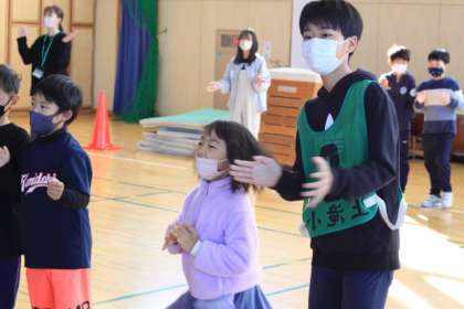 そして2つ目のプログラムはリズムアンサンブルです。手拍子でリズムを刻んでいきますが、1年生と6年生で仲良く楽しんでいるようです。(写真3枚目)