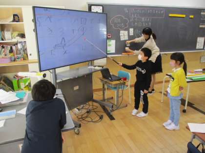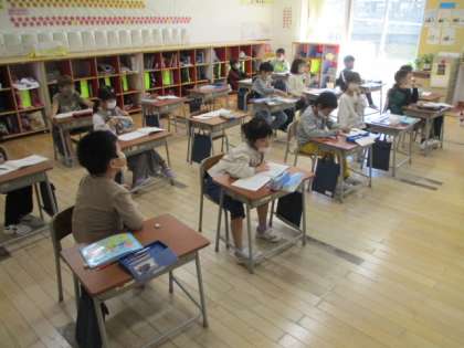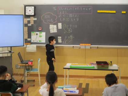 2時間目の1年生は算数の授業でした。今日の学習内容は、繰り上がりのあるたし算で、3+9を学習しました。その際には、1つの数を2つに分解し10を作る考え方をしています。例えば、