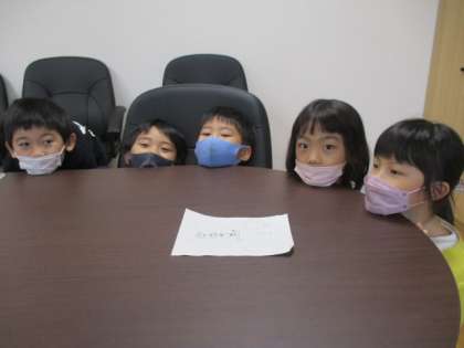 お昼休みに、かわいいお客さんの訪問を受けました。1年生の仲良し5人衆です。5人はテーブルを使って、千と千尋の神隠しに出てくる「かしら」を演じています。但し、こちらの「かしら」は縦に並ぶことはできません。