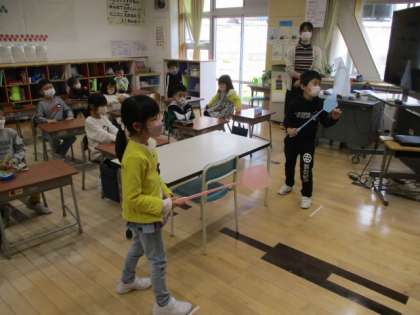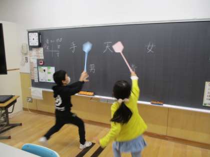 前の記事の答えは、国語の授業で、黒板と赤青2本のハエ叩きを使った言わば「漢字カルタ」をしているところです。
