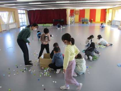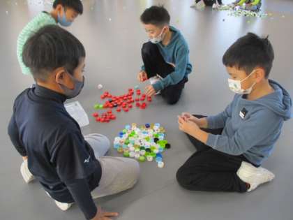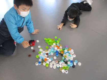2時間目の1年生は図画工作の授業でした。今日の授業では「いっぱいつかって なにしよう」という学習課題で、大量のペットボトルキャップを利用して何かを作り上げます。さて、どんな作品ができるでしょうか。