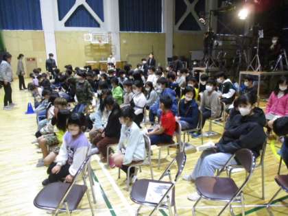 特別校時で午前中を終えた本日、午後の早い時間から全校児童が体育館に集まり、江戸糸あやつり人形「結城座」の巡回講演を鑑賞しました。