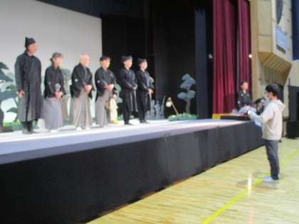 最後の演目は「東海道中膝栗毛〜赤坂並木から卵塔場まで〜」でした。演技の初めに、村人と旅人の人形を児童の代表が操りました。その様子を動画にしましたので、そちらもご覧ください。