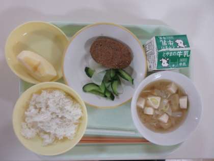 本日の献立は、和風煮込みハンバーグ、きざみあえ、豆腐のみそ汁、りんご、ご飯、牛乳です。