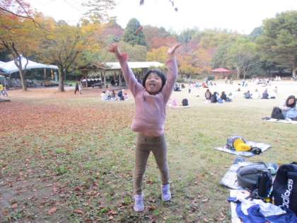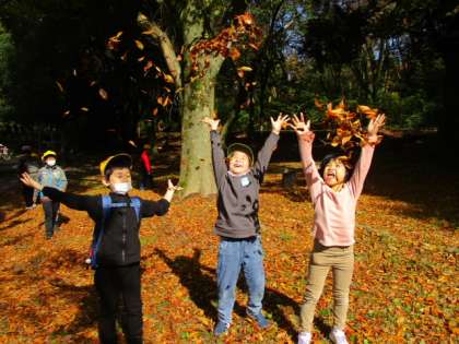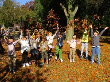秋は枯れ葉の季節。しかしその枯れ葉も楽しい遊び道具です。1人が3人に、どんどん増えていきました。