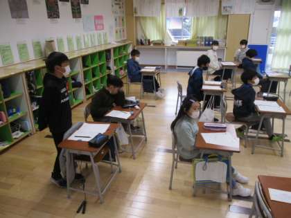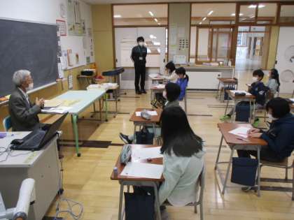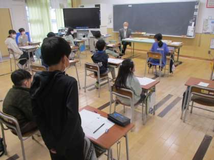 4年生の2時間目は、総合的な学習の時間でした。今日はゲストティーチャーに来ていただき、常済用水プロムナードの清掃活動についてお話を伺いました。
