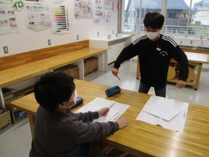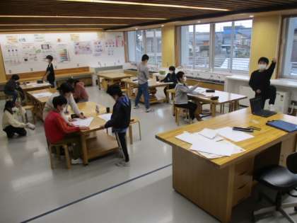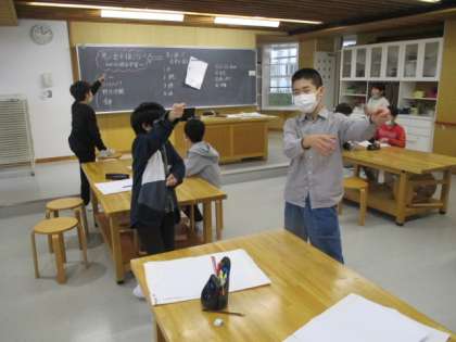 正解は、自分のペアの人にポーズをとってもらっているところです。それぞれのポーズは、宿泊学習の1コマを表しています。そのポーズを参考に絵を描いていきます。しかし、ポーズをとり続けるのは以外にきついものです。そこで5分で交代していきます。