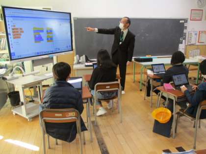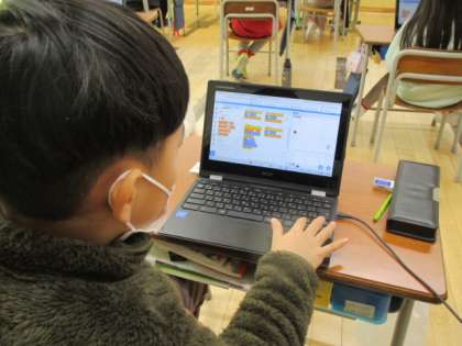 2時間目の4年生は、支援員の方に教えていただきながらプログラム学習に取り組みました。今日のプログラムは、画面上のネコを操作してリンゴをゲットするゲームです。