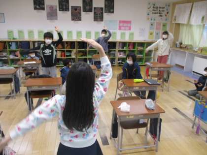 4年生教室では、正に克己会の活動を始めようとしているところでした。活動の内容は、1枚目の写真にあるように、大きなサイコロを転がし決めることになっています。今日の活動は、ミュージックタイムでお馴染みの「三時のおやつ」でした。久しぶりに取り組むので、両手を体の前に伸ばし大きく二等辺三角形を作るポーズが、ショートケーキだったかチーズケーキだったか、みんなで迷っていました。