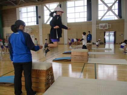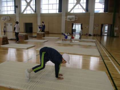次に課題が変わりました。跳び箱に両手を付いた後、飛び乗り。降りた後は、マットでより前に手をつくカエル跳び。直ぐに別の列について、跳び箱に両手を付いたままロイター板の利用して大きく3連続ジャンプ。最後に再びカエル跳びです。