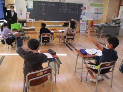1時間目の3年生は算数の授業でした。今学習している内容は小数です。この授業では、例えば1.8Lの水の量などを具体的に理解していました。