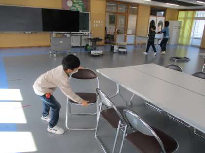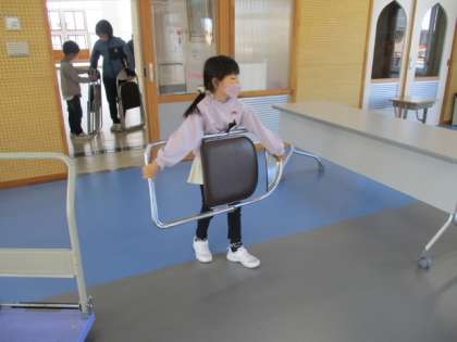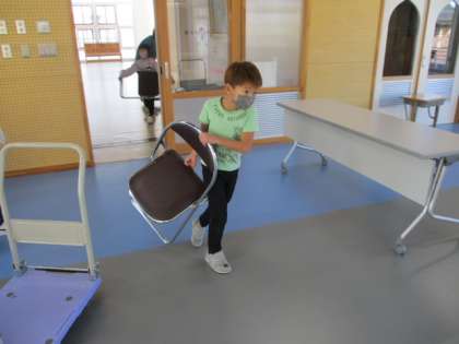 2時間目の休み時間に「カフェ和いわい」の準備をしていたところ、廊下を通りかかった子供たちが、椅子運びの手助けをしてくれました。1年生は1回に付きパイプ椅子1つ、3年生は2つを何度か運んでくれました。大人が運べば6つは運べますが、何より子供たちの優しい気持ちが嬉しかったです。本当にありがとう。