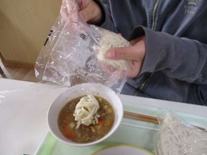大人になるとほとんどお目にかかることのないメニューに、ソフト麺があります。カレー味や今日の給食の肉味噌もおいしいものです。