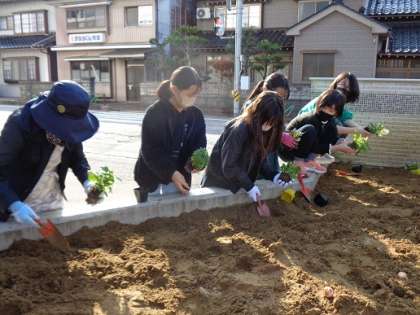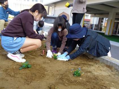 1時間目に地域の方々に協力していただき、花壇の苗植えを行いました。土を一緒に耕したり、苗の植え方を教わったりしました。来年の春、きれいに咲くように今後もお世話を続けていきます。