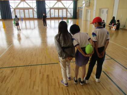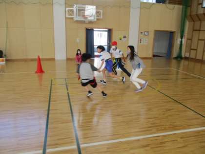 1・2枚目の攻撃側は、同じく「誰が持っているか分からないようにする戦術」を使っています。しかし3枚目のチームは、本当のアメリカンフットボールの様に、前方にボールをパスして受け取る戦術を使いました。そして何と高得点をゲットしました。(3枚目の写真に、投げられたグリーンのボールが映っています)