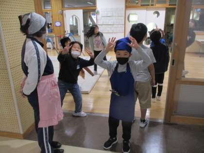 写真1枚目は1年生の配膳の様子です。2枚目は、2年生が教室前で集合してランチルームに向かうところ。3枚目は、3年生が盛り付け終わった給食を取りに行くところです。