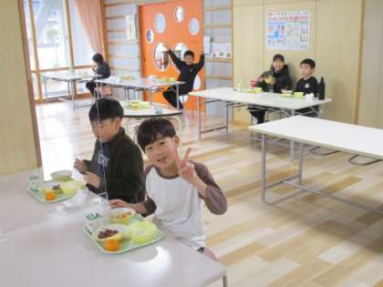 1枚目の写真は、4年生がおいしく給食を食べているところ。2枚目は、5年生が「いただきます」直後に食べ始めたところ。3枚目は、鏡越しに配膳された給食を取りに行く6年生を撮したところです。