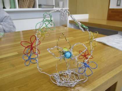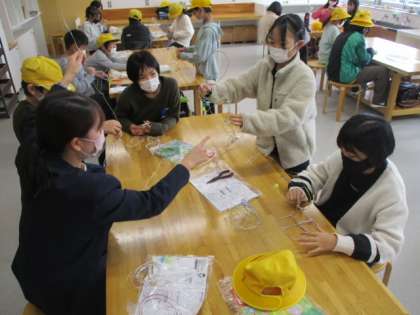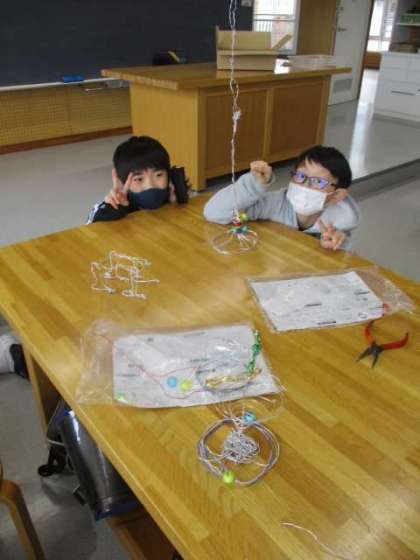 5年生の5時間目は図画工作の授業で、以前の記事でお伝えしていた「ワイヤーアート」の作品づくりの続きをしました。作品もかなり完成に近づき、児童それぞれの個性が見えてきました。