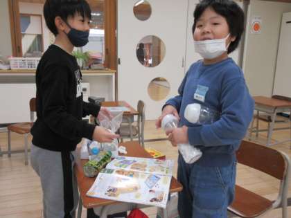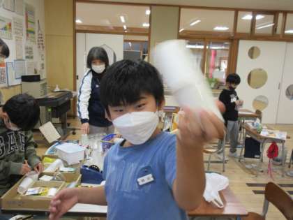2年生は、図工の時間に身近な材料を使って楽器を作っていました。ギターやマラカス等を作って、どんな音がするのか確かめながら、修正しています。絵を描いてかわいくしている子供もいます。