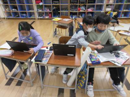 3年生は、スーパーマーケットを見学して、分かったことや思ったことを壁新聞にまとめます。今日は、クロームブックを使って、貼りたい写真を選び、たくさん売るための工夫や、お客さんにとって便利なことなどを考えて、説明の文を書きました。