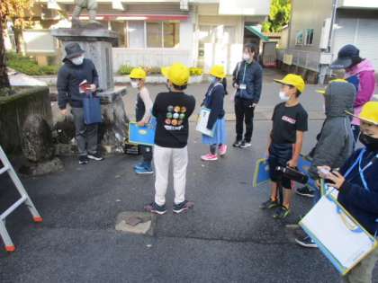 一行は早速、学校敷地内にある「始水石」の説明を受けていました。