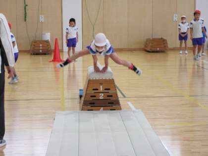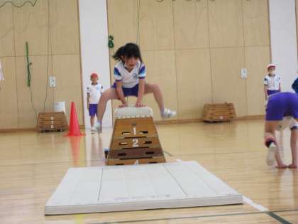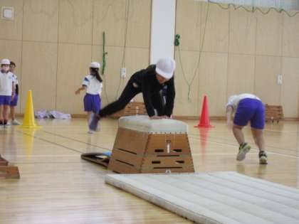 5時間目は体育です。元気いっぱいに跳び箱を跳んでいる、1,2年生です。