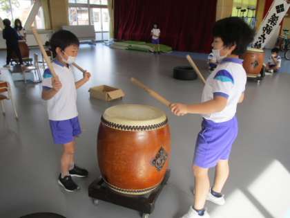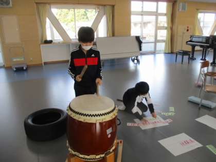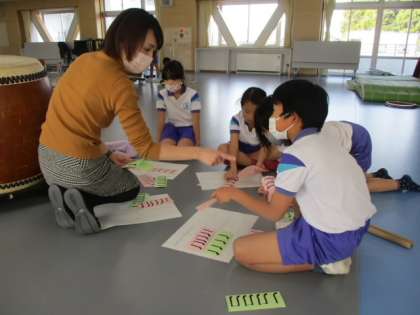 2時間目の2年生は、みんなの広場を使って音楽の授業をしました。この授業では太鼓を持ち出し、各班毎に、パターン化したリズムを組み合わせ、班のオリジナルリズムを作ります。様子を見ていると、直ぐに太鼓を鳴らし始める班がある一方、じっくりと考えることから始める班もありました。それぞれの個性が出るものです。