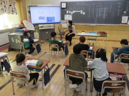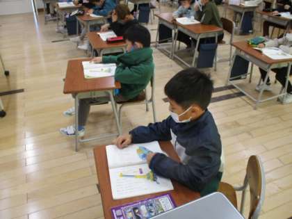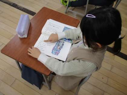 1年生の3時間目の授業は国語でした。今学習しているのは「じどう車しらべ」という説明文です。まずは基本の読みから入ります。文字を追うために、指で文章をなぞっていきました。