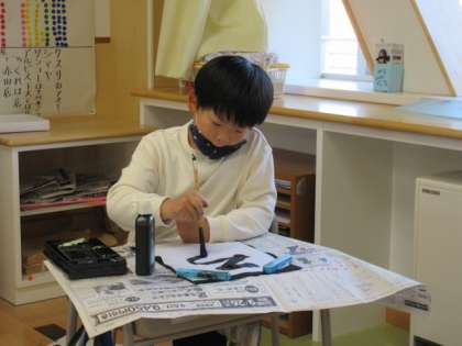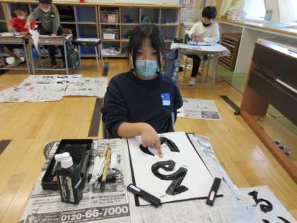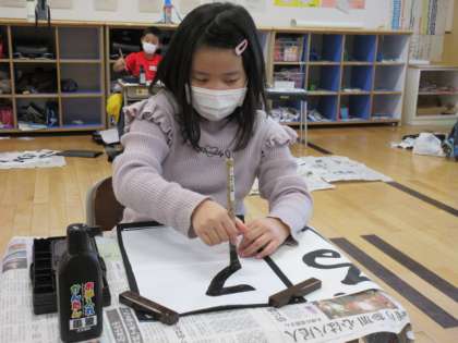 3年生は書き初めで、「明るい心」と書きます。前回は「明」を練習したので、今日は「るい」の練習をしました。「る」は特に難しく、上手に書くにはいくつかコツがあります。初めは苦戦していましたが、1時間でずいぶんと上達しました。