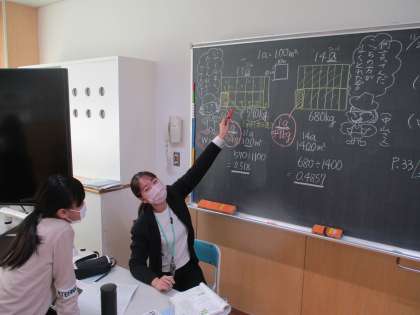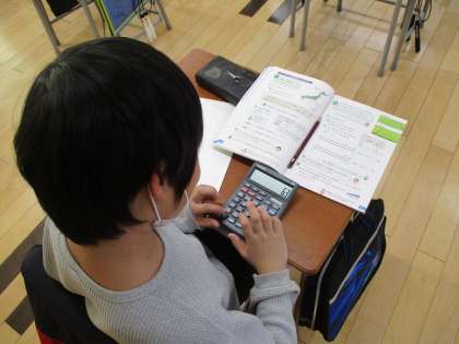 5年生の2時間目は算数の授業でした。以前からの学習の続きで、単位量あたりで比較する内容です。この学習では、大人には身近な「自動車の燃費」について計算していました。