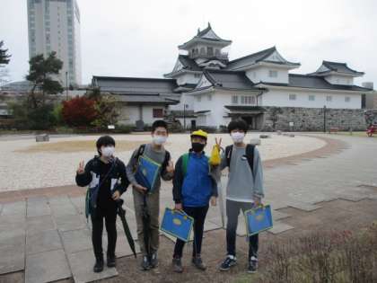 中 : 富山城をバックに