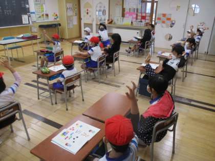 ちなみに2枚目の写真は、担任の先生が「次はニンジンの数え方。ニンジンが好きな人?」と問いかけたときの様子です。