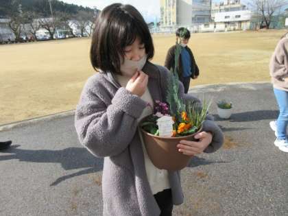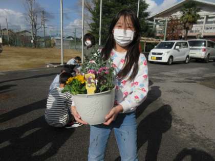 地域の方に講師となっていただき、寄せ植え体験をしました。公民館の方が花の苗を準備してくださり、一人一人好きな苗を選び、組み合わせを考えて植えました。