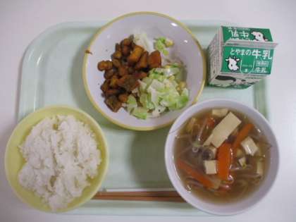 今日の給食献立は、ご飯、牛乳、魚と豆のカレー揚げ、レンコンサラダ、とうふスープ でした。