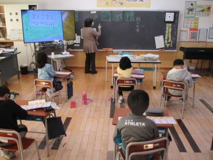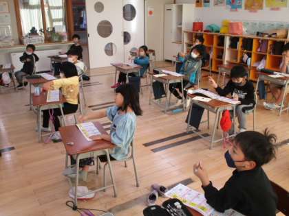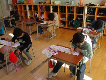 2年生の「さわやかタイム」は、漢字の練習でした。今日は「野」「原」「冬」の3文字を習っているところでした。書き順や読みを一通り習った後は、ドリルで繰り返しの練習です。がんばっています。