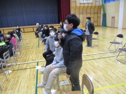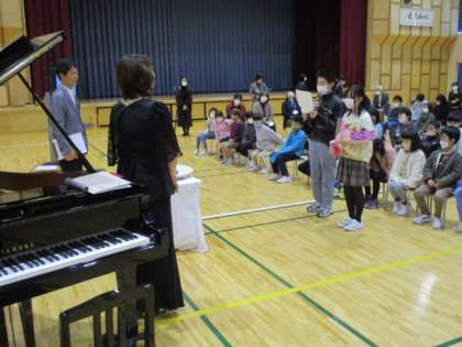 1時間弱の楽しい時間も終わりに近づいてきました。お二方に質問する時間がありましたので、たくさんの児童が質問をしましたが、時間が足りず質問できなかった人がいるくらいです。そして最後には、代表児童による「お礼の言葉」と花束の贈呈がありました。