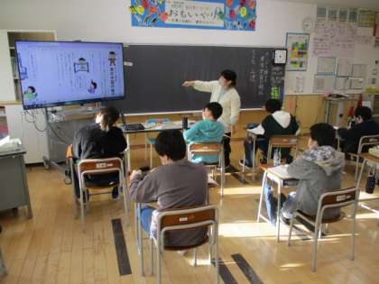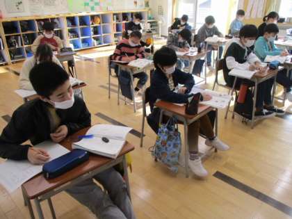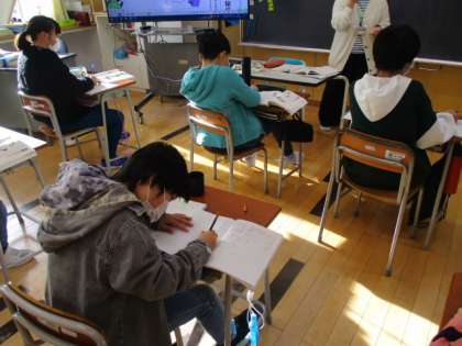 6年生の「さわやかタイム」をのぞいてみると、国語の教科書を使って漢字の学習を進めていました。今学習しているのは、「カンジー博士の『漢字学習の秘伝』」というところでした。